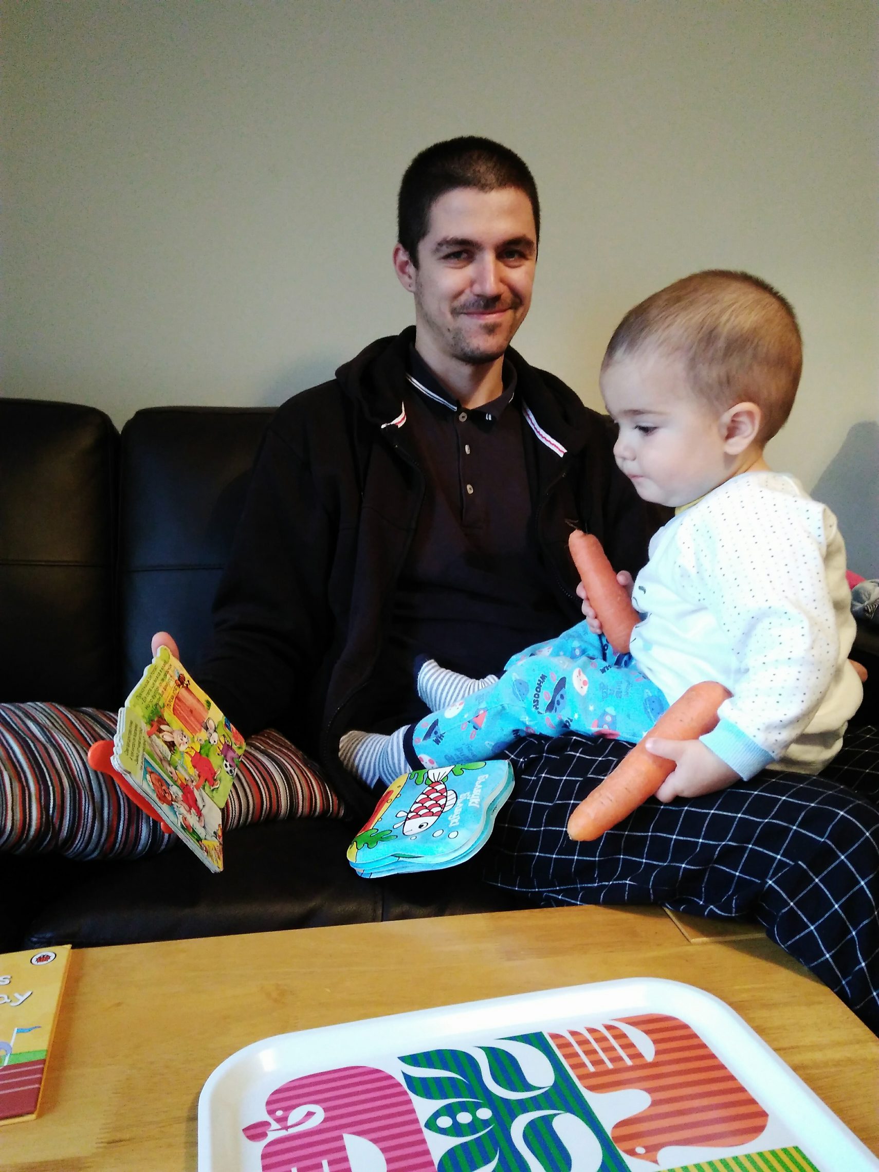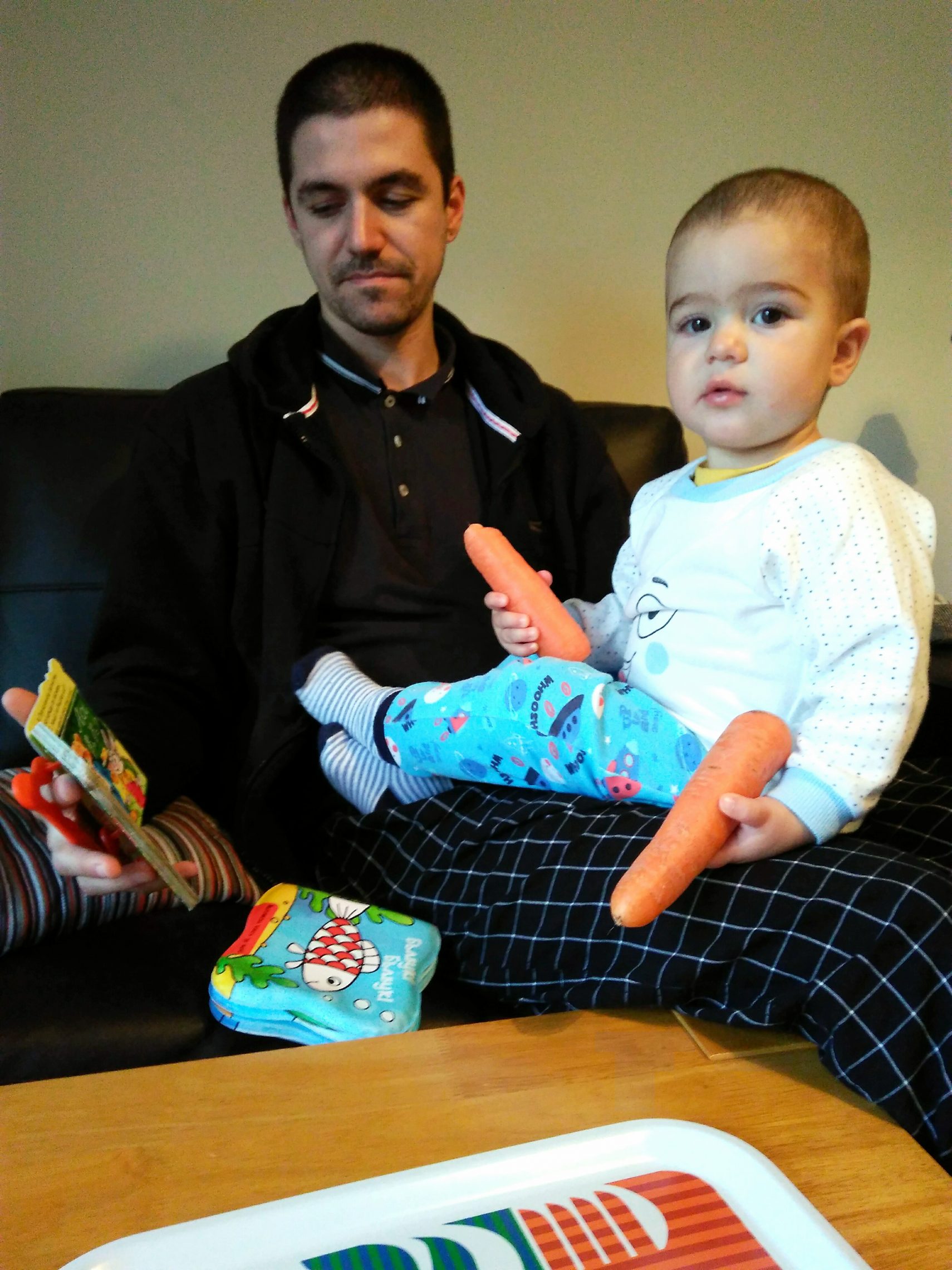 Виктор вчера се събуди от следобедната дрямка, видя, че покупките са пристигнали, подреди и взе да си носи два “маня” в лапите, за респект. Намести се удобно в баща си и с по един морков посочваше кога да разлисти книжката за “Патилата на Зайко”. От време на време се обръщаше към мен да му подам парченце плод в устата (защото, нали, няма свободна лапа да си хапва сам).