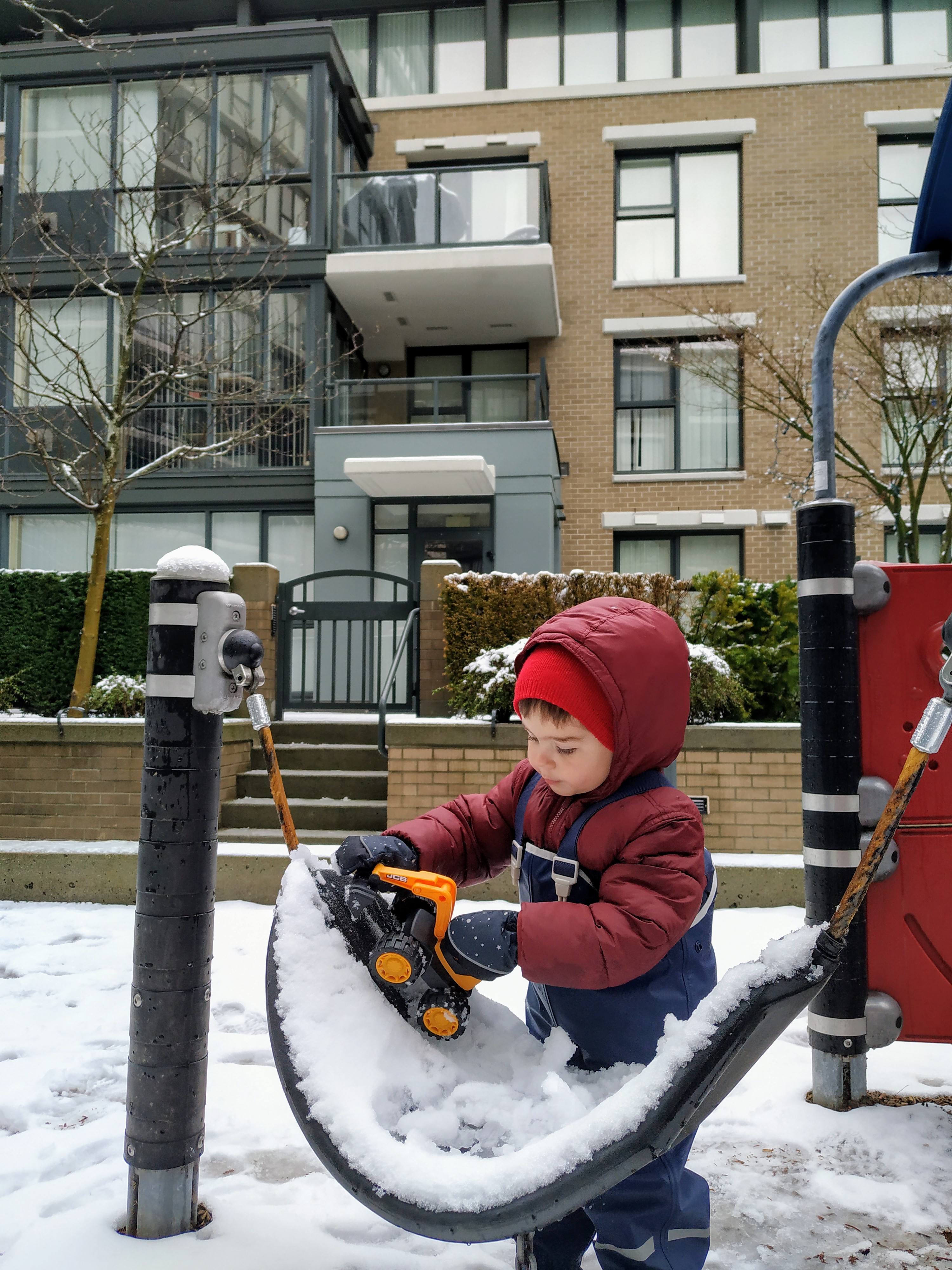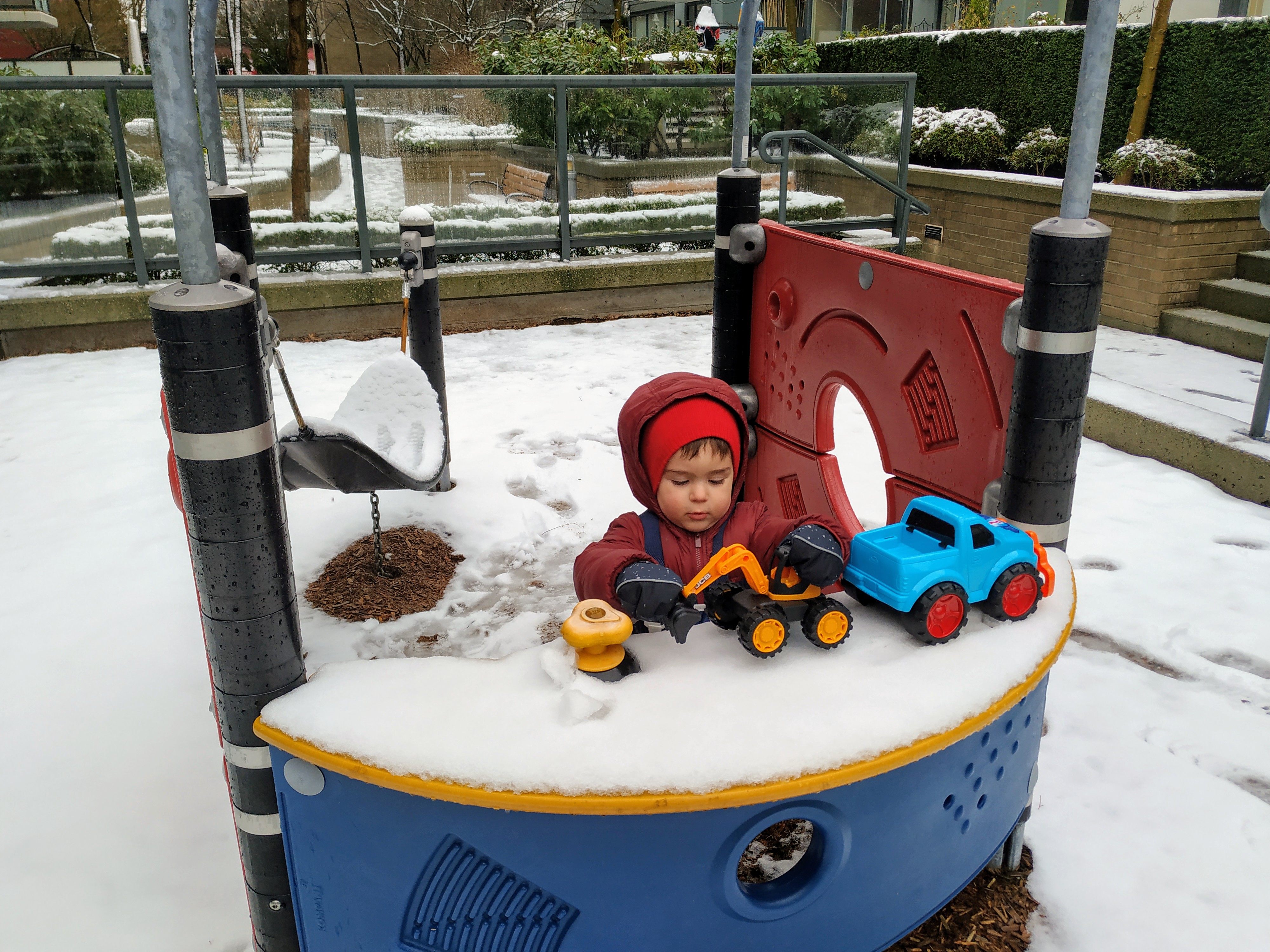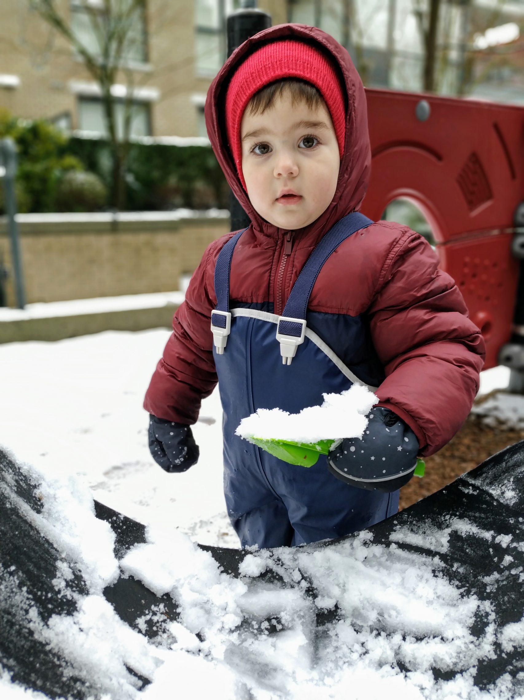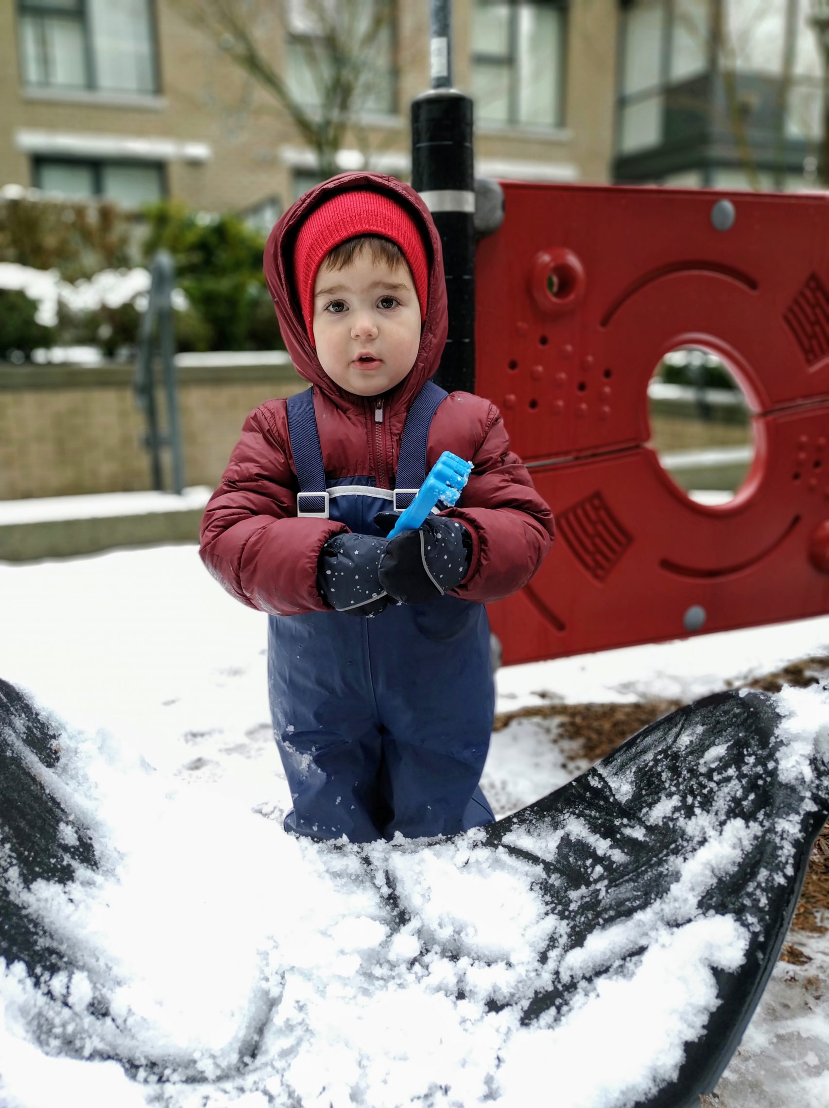 Днес за малко да отбележим първи ден в Канада, в който да не сме излизали. За щастие по обяд снеговалежът спря и слязохме до вътрешния двор да поиграем на магазин и на “садене на зеленчуци”.